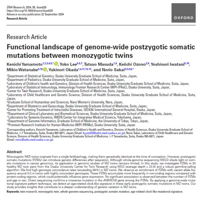 一卵性双生児は遺伝子が全く同じ、とされていますが、本当に100%同じDNA配列か?という疑問に答える論文が、ツインリサーチセンターのデータをもとに発表されました。