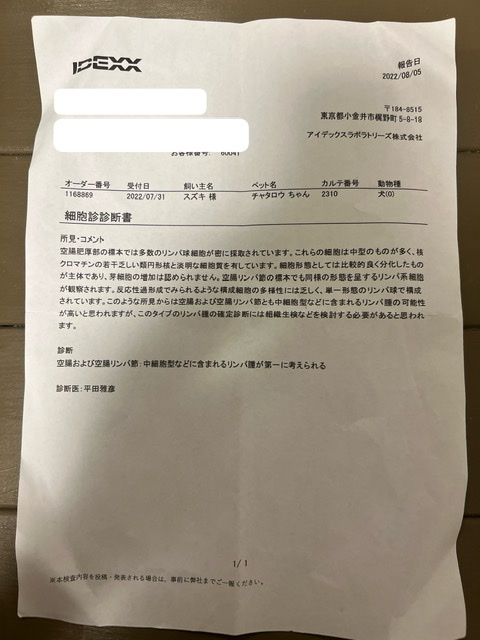 2022年8/6に、空調および空調リンパ節のリンパ腫と診断され