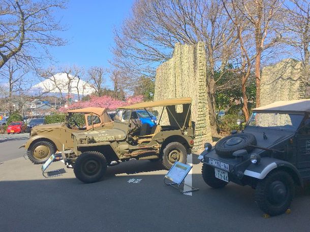 週末は好天に恵まれて、富士山もくっきりと一日中姿を見せてくれ、早咲きの河津桜が満開の「御殿場高原 時の栖」には、多くの来場がありました。高原ホテルエントランスでの日米独、三台の1940年頃の軍用車両の展示は、多くの方に見学してもらうことができました。