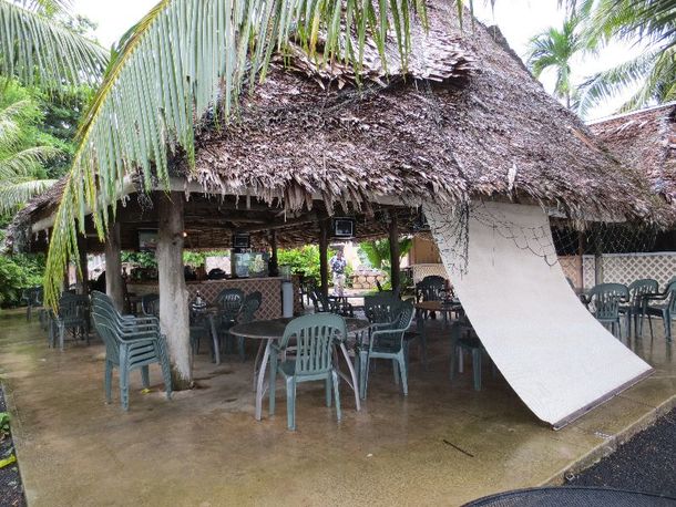スコールが来そうだからと、ガイドさんが一休みしましょうということで休憩していると……本当に土砂降りに!?ナンピル川の河口にあたるこのカフェで、初めてスコールなるものを経験させていただきました。