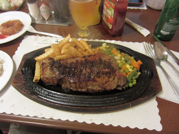 宿泊先のジョイホテルさんに戻って、早めの夕食はペッパーステーキ(26USドル2014年現在)です。もちろん、ビールはバドワイザーです♪