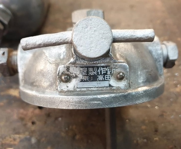 これは燃料タンクから、噴射ポンプに至るライン上に設置される燃料の不純物を取り除く装置ですが、銘板には「土屋製作所、東京、高田」の文字が確認できます!