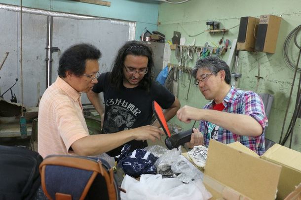 ロシア人技術者に、日本製の当時モノの腕木式方向器を寄贈した際の様子。(くろがね四起のTシャツを着ているのが、チーフメカニックのM氏)