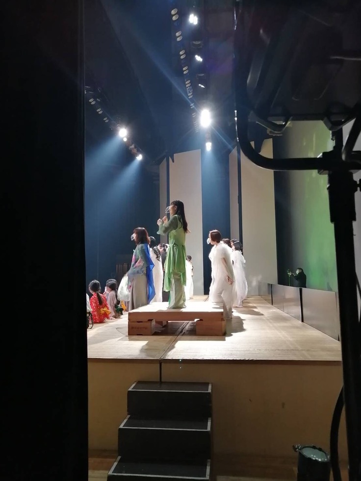 日常生活でもマスク着用が当たり前の中、表情での表現も多いオペラにおいてこの問題をどうするか悩んだ結果、フェイスシールドをマスク型にしたような「近大マスク」を着用して公演を行いました。(子ども一般的なマスクを着用)
