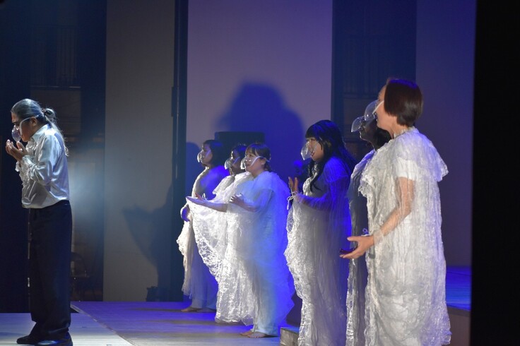 本来は主人公を取り囲むようにして歌う場面も、今回は、飛沫対策として正面を向いて歌うように変更しました。