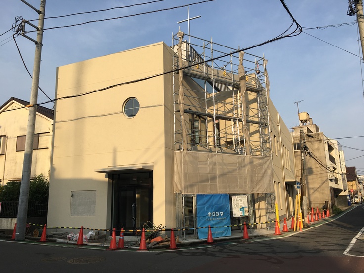 みなさま、その節は大変お世話になり、ありがとうございました。無事、目標額を達成し、入金も確認されました。本体工事はほぼ完了し、外構工事と内装の仕上げに入っています。そして、いよいよ、みなさまにご支援いただいた、木製スクリーンの設置工事に入ろうか、という段階まで来ました。まずは、足場が組まれ、準備が始まったところです。完成まで、引き続き、お祈り下さい。