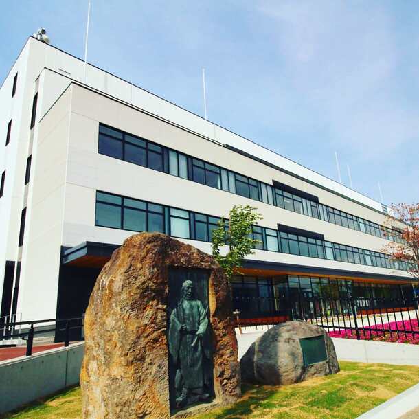 5/6(8日目) 米沢市役所新庁舎が始動しました!南の角には上杉の城下町の基礎を作った「直江兼続公」の石碑!第二代上杉景勝公の宰相です。