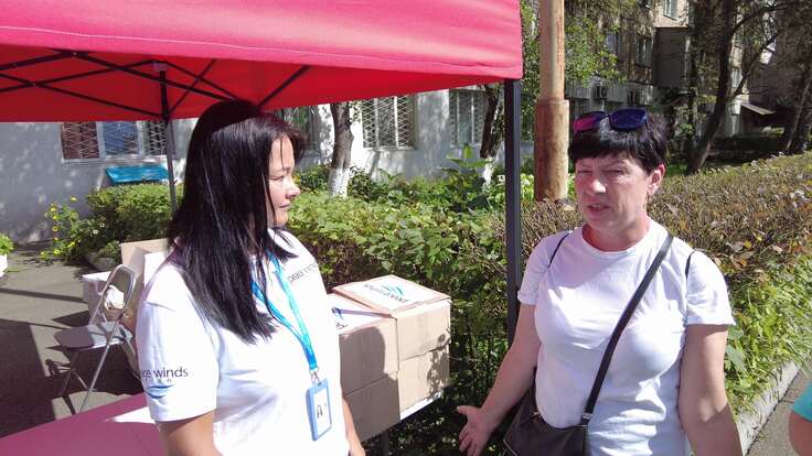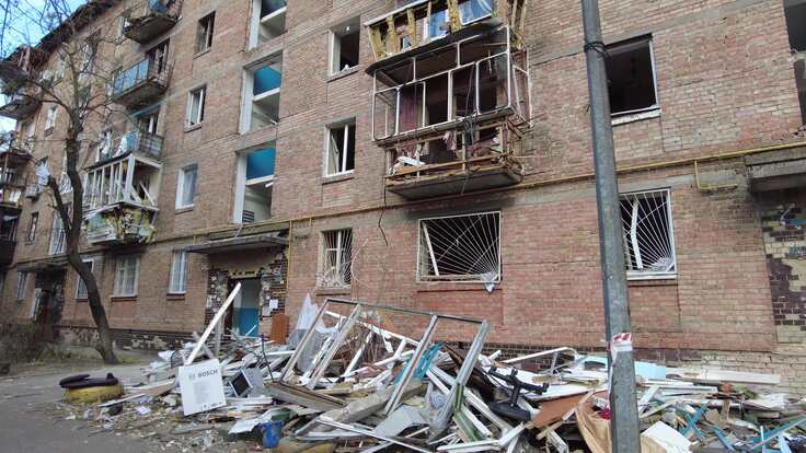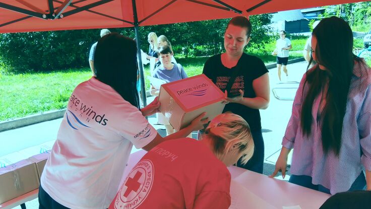 7月のロシア軍による大規模攻撃では、小児病院だけではなく、キーウ市内の住宅地も大きな被害を受けました。シェフチェンスキー地区の5階建て集合住宅にも、ミサイルが直撃。建物が倒壊したり、部屋が吹き飛ばされたりし、多くの住民が一瞬にして家を失いました。ピースウィンズは8月14日、ウクライナ赤十字とともに、被害にあった150世帯に緊急支援物資を届けました。