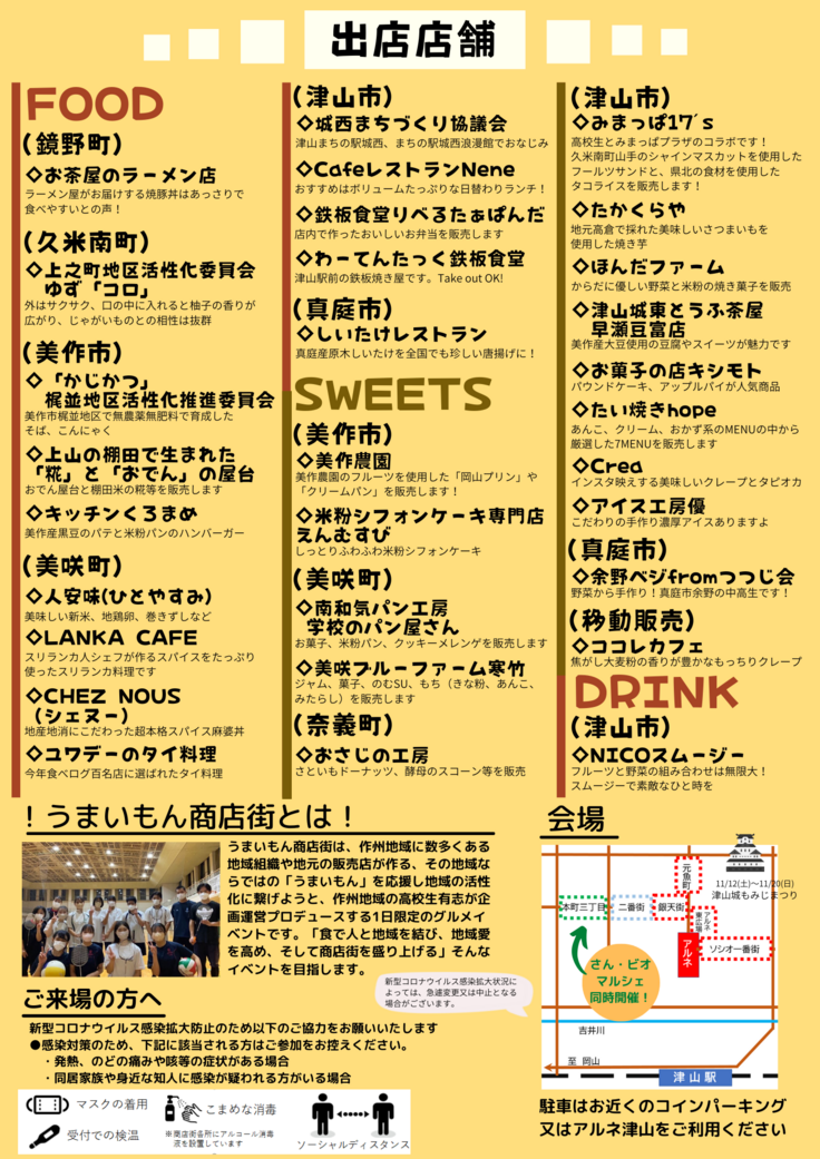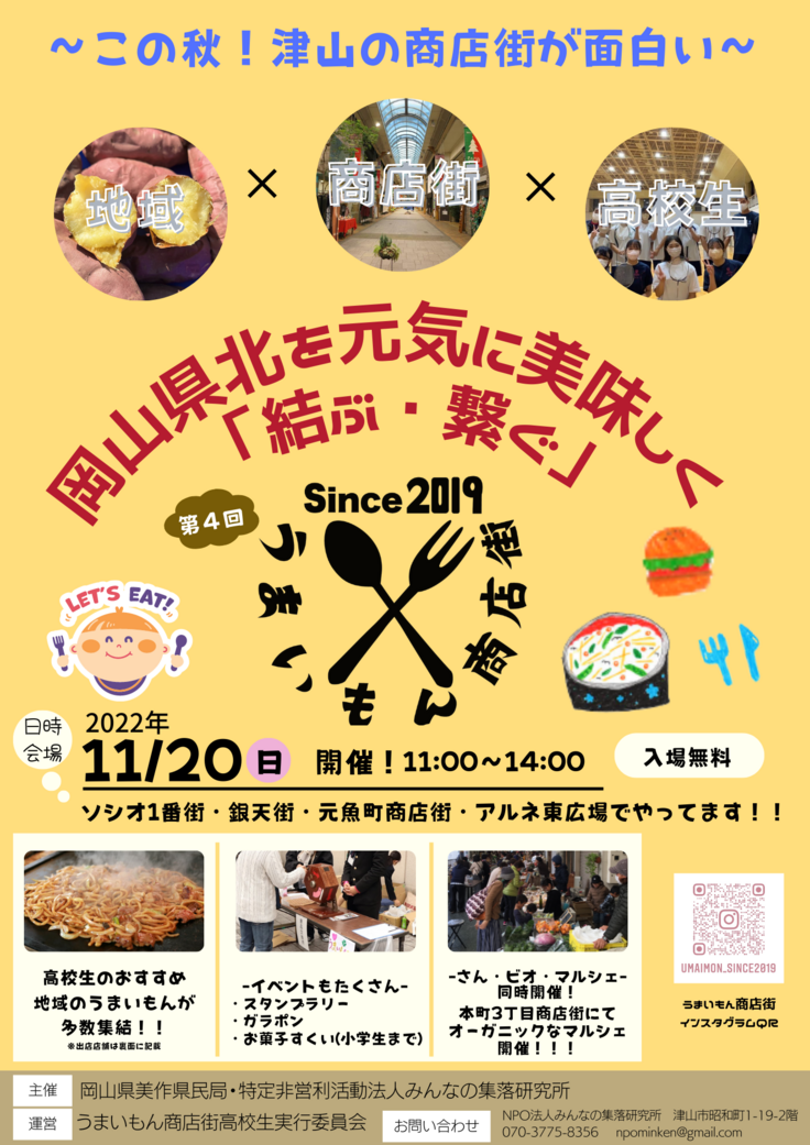 僕たちの先輩が過去3回、岡山県北地域を繋げ、盛り上げるために企画・運営を行ってきた「うまいもん商店街」を、今年は僕たちが引継いで2022年11月20日(日)に第4回としてソシオ一番街、津山銀天街、元魚町商店街、アルネ東広場にて開催することが決定いたしました!