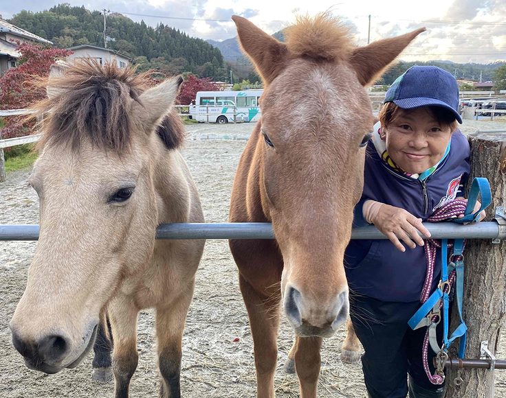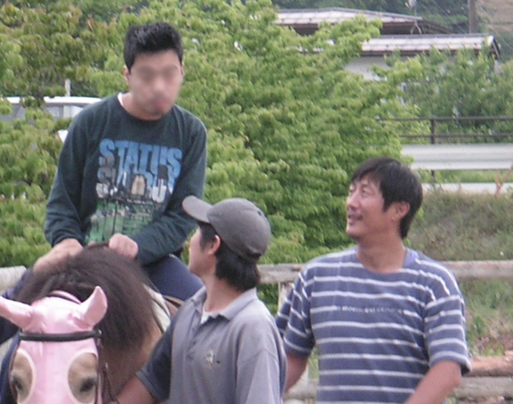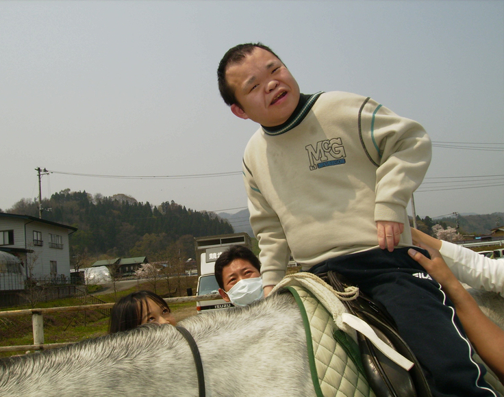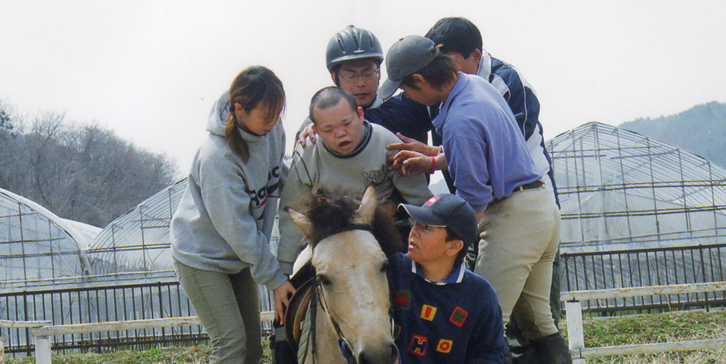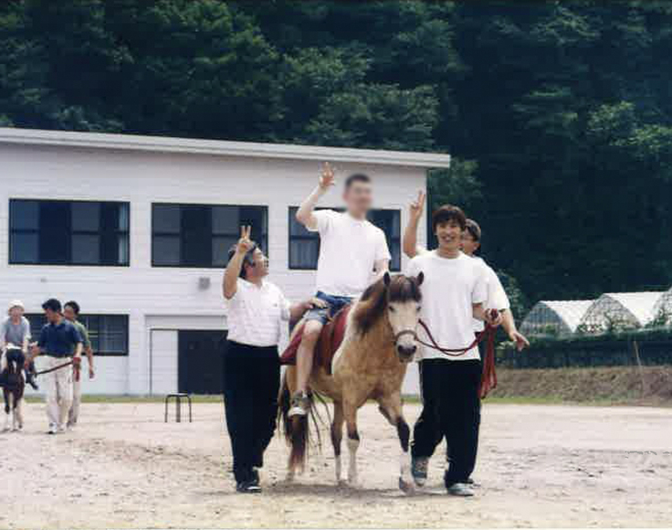 私が障がい者乗馬(ホースセラピー)という言葉をはじめて知ったのは平成13年、県内にある障がい者施設で乗馬活動を行っているという話を聞き、自分たちの施設の利用者さん数名を連れて馬に乗りに行きました。利用者さんが乗せて頂いた馬は小さなポニー、その時がはじめての馬との出会いでした。施設内で私が担当させて頂いていた40代の女性、その方はろうあ者で他人と関わることはほとんどなく施設生活の中では全く笑顔を見せる事はありませんでした。初めて馬を目の前にし、緊張もある中、彼女は恐る恐る片足を上げ馬にまたがりました。不安そうな顔を見せながらも馬がゆっくり歩きだしたその途端、表情が一変!!なんと満面の笑顔に変わったのです。その時の驚き、感動は今でも忘れられません。初めて見る彼女の笑顔を写真に収め、後日お母様にお見せした時、こんな笑顔を初めて見た!!と涙されたことがとても印象に残っています。外部での乗馬活動を何度も繰り返していくうちに、自分の施設で馬を飼い、乗りたいときに乗れる環境が欲しい、もっとたくさんの利用者さんに馬に乗って笑顔になってもらいたい、という思いを持ち始めました。