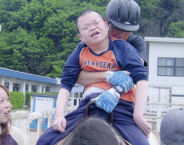 平成18年、弛緩性の脳性小児麻痺で1人では座位を保つことができない車いすの息子さんを連れたお母様が乗馬をさせてあげたいという事で来園されました。座位の取れない方の乗馬依頼は初めてだったので初めはスタッフが同乗し本人を抱えての乗馬から始めました。