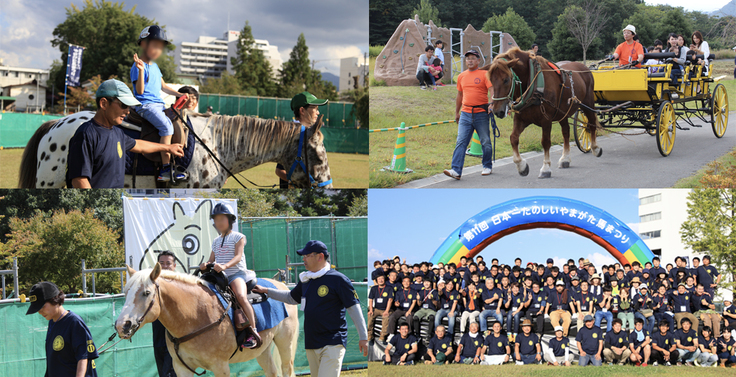 障がいの有無に関わらず、乗馬の楽しさを多くの人に知ってもらいたい、障がいを持っている方々が馬に乗ることで様々な効果が得られるんだよということを多くの人に伝えたい、馬に乗ってみんな笑顔になってもらいたい、そんな思いから山形市内の福祉施設、特別支援学校、一般企業に勤める仲間たちに声をかけ有志を募り、馬まつりイベントの実行委員会を立ち上げました。平成19年より始めた馬との触れ合いイベントです。初めてのの開催に向けて企業、そして個人様より協賛金を集め、試行錯誤しながらの準備を行い平成19年9月30日(日)第1回やまがた馬まつり開催が実現しました。年々来場者も増え、令和1年に行われた「第13回やまがた馬まつり」では約1万人の来場者があり、乗馬や馬たちとの触れ合いを楽しんでいかれました。山形県、山形市からも後援を頂きながら多くの企業からのボランティアも定着し、毎年総勢100名を超すスタッフに支えられ、馬まつりを開催しています。残念ながら昨年、今年の馬まつりはコロナの影響で中止とさせて頂きました。