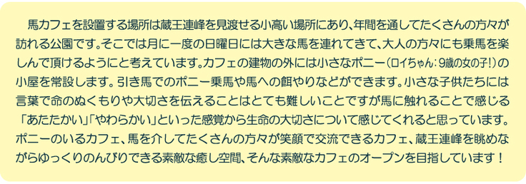 最初にも述べましたが、乗馬による様々な効果を「たくさんの方々に伝えたい!」「もっともっと気軽に馬と関わってほしい!」「馬に乗ってほしい!」という思いを長年の夢にとしてきました!!馬を介して交流の場を作りたい、乗馬ができる、馬と触れ合える、そして障がい者も健常者も同じ空間の中で交流が生まれ、そこにいるだけで心と体が癒される、そんな素敵なカフェを作りたい!!と馬カフェをオープンさせるために現在様々な準備を進めています。
