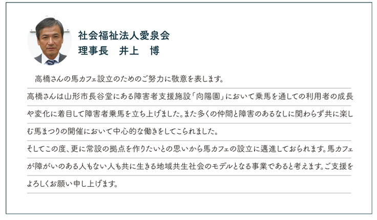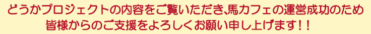 乗馬による様々な効果を「たくさんの方々に伝えたい!」「もっともっと気軽に馬と関わってほしい!」「馬に乗ってほしい!」という思いを長年の夢としてきました。馬を介して交流の場を作りたい、乗馬ができる、馬と触れ合える、そして障がい者も健常者も同じ空間の中で交流が生まれ、そこにいるだけで心と体が癒される、そんな素敵なカフェを作りたいという思いからこのプロジェクトを立ち上げました。(※掲載イメージ写真は施設利用の方のため一部加工してあります)