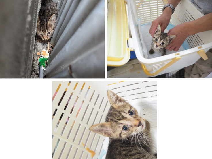 8月21日日曜日近くの会員さんから電話が有り子猫がブロック塀とトタンに挟まれて鳴いてると、手も網も入らない隙間に落ちた様です。