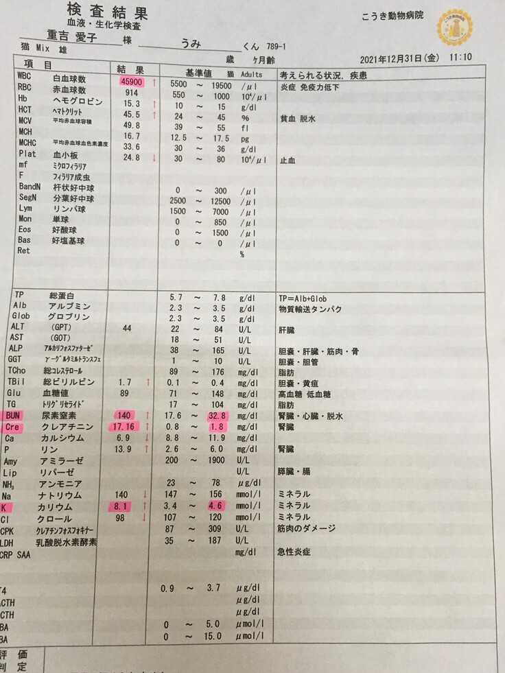 結果は、尿管閉塞からの急性腎不全、高カリウム血症との診断でした。