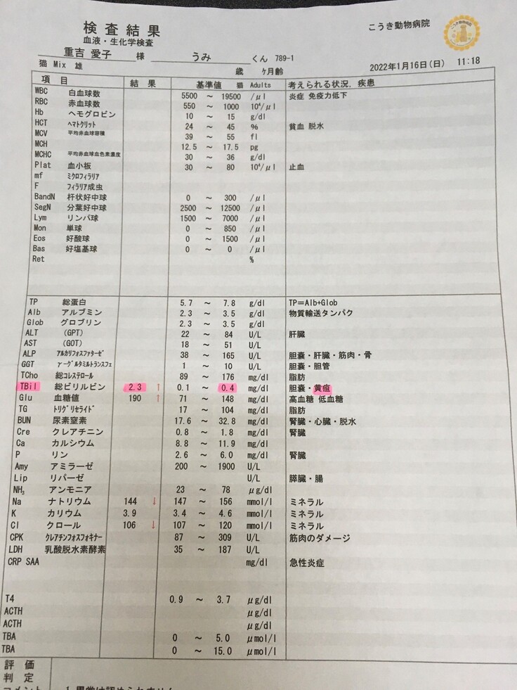 黄疸が出ていたため血液検査をすると、やはり肝リピドーシスになっているとの診断がくだりました。