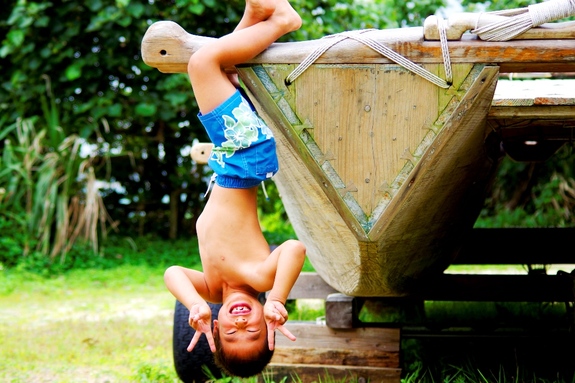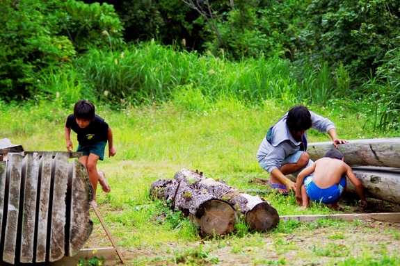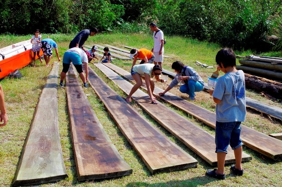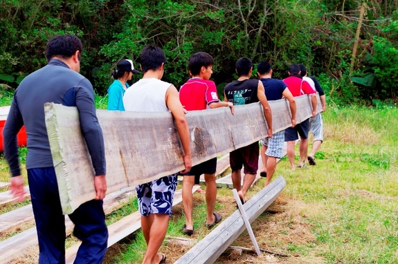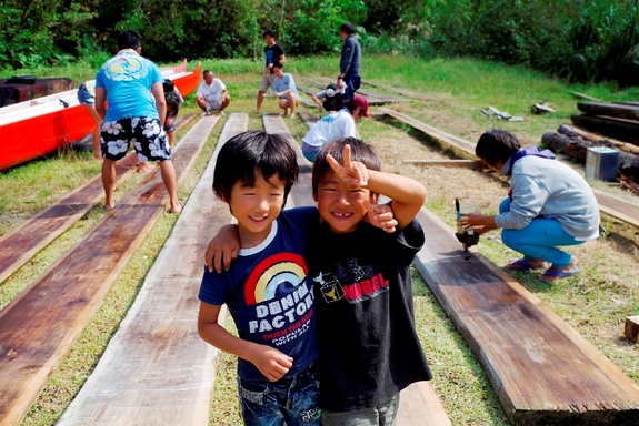 二号建造を夢見て全長10mを越す飫肥杉を伐採したものの、重すぎる大木は僕一人の力では到底動かすこともできません。年に2回、地元成人会の仲間や県外から集まってくれた家族、友人、そして教え子の学生達と海遊びしながら、皆の力を合わせて大木を移動して防腐剤を塗る作業をしていると、ブログやフェイスブックを見た人の輪が徐々に広がっていきました。サバニのメインテナンス作業をしていると、登下校の小学生が集まり作業を手伝ってくれるようになりました。独身生活が長かった僕はそんな純粋な子供たちの存在が何よりも大きなエネルギーでした。そして海遊びを通して繋がった母子とついに新しい家族の縁を結びました。