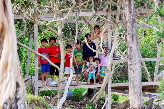 5月5日(こどもの日)は毎年恒例の親戚仲間が弁当を持って海に集まるピクニックをしました。先週、海人丸一号をサンゴ礁に囲まれた安部(アブ)という部落に移動しましたが、ここは波が押し寄せることがないとても安全な海です。帆柱(マスト)をたおして錨をおろした海人丸は海に浮ぶジャングルジムのような遊び場になります。この日は午後の満潮時刻に合わせて朝からカヌーの紐結び作業を行いました。綿の紐で縛り組み立てるのはとても力がかかります。組み立てが終わる頃には遠くに見えるサーフポイントに徐々に潮が満ち波が崩れはじめました。