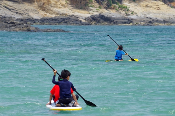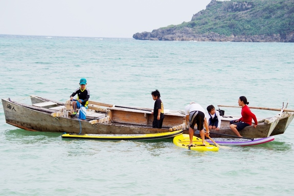 たまにサーフィンするカヌーがひっくり返る時もあります。その時は乗組員4人全員が立ち泳ぎしながらカヌーを戻し、中の水を汲み出してから再乗艇する作業になるのでとても大変です。SUPでもカヌーでも上手く波に乗れれば大喜びし、海に投げ出されたらボードまで必死に泳ぎます。