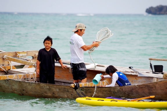 海人丸は二隻のサバニを繋げたシンプルな形です。その基本となるのが紐結びの作業です。荒れた海で船体がバラバラにならない理由は、柔軟性に富んだ紐の結び目は四方八方からの力を分散するからです。鉄のボルトやナットを使って頑丈に溶接する必要はありません。アウトリガーカヌーの紐結びも同じように子供たちは自然と覚えていきます。