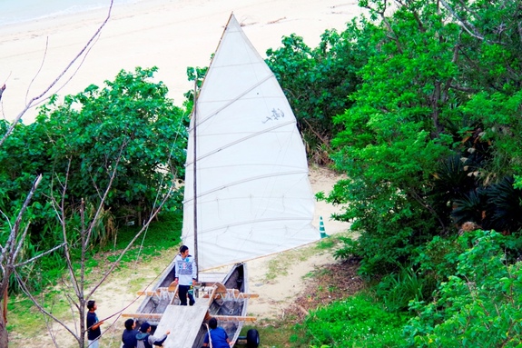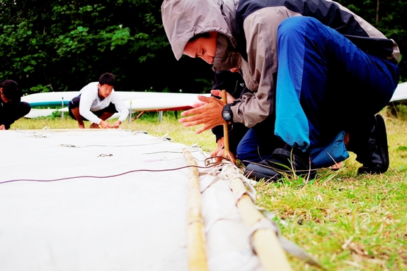 海人丸はカヌーの紐結び技術を応用しサバニ2隻を繋いでいます。カヌーは1時間程で完成しますが、海人丸一号は約2ヵ月もの間紐を結ぶ作業がかかりますからとても労力がかかります。使った後は、皆で力を合わせてカヌーを運びます。陸も海も紐結びも仲間の協力が無ければ効率よく進みません。チームワークは時間をかけて構築します。
