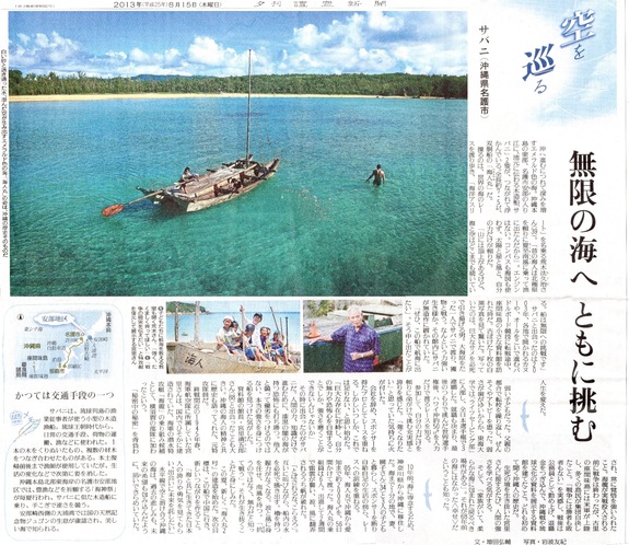 そして2週間後、自宅に新聞が届き驚きました。彼は単に海人丸プロジェクトや僕自身を取材したかったのではなく、海と空、すなわち地球と人の関わり方。そして人の生き方そのものに興味があったように思いました。僕が初めて沖縄を訪れた時に出会った宮里さんから物凄い衝撃的な戦争の話を聞き、そして同時にサメをサバニに引き上げる一人の海人の白黒写真から更に衝撃を受けました。それは僕はこの島に地に足を付けて暮らし、そして死ぬまでこの島で生き抜く覚悟をする十分な動機付けでした。Ready for支援者の方々にも是非文章を呼んでいただきたいです。お時間があるときにHPをご覧ください。