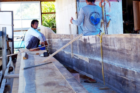 さて、ハワイ滞在でご報告が遅れましたが、二号建造は現在着々と前進しています。サバニの両側になる”側板(そばいた)”という部分の接着が終わり、図面に合せてテンプレートを作り切り抜く段階です。