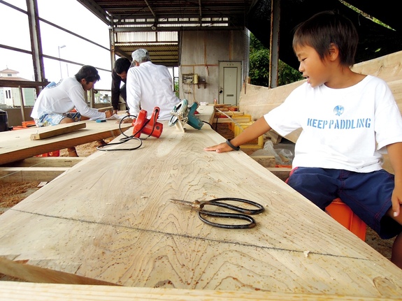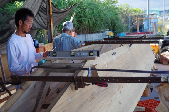 足りない部分の材料は既に嶺井さんが乾燥させていたものを使わせてもらいました。(これも当然飫肥杉です) 通常サバニと呼ばれる沖縄の木造船は現在大きく二つに分けられます。一つは風を受けて進む昔、漁業目的に使われた”帆かけサバニ”、そしてもう一つが毎年沖縄各地で毎週末の様に開催される船漕ぎ競争”ハーレー船”です。