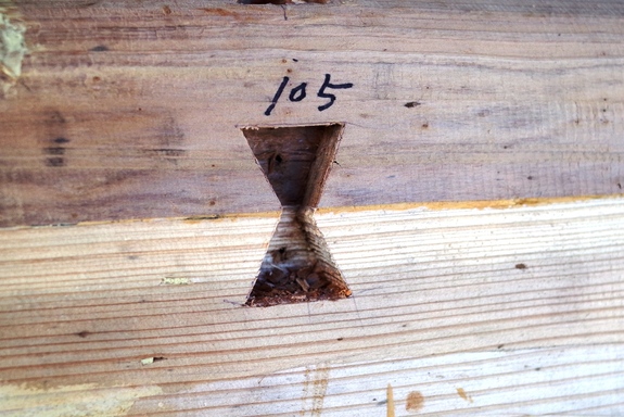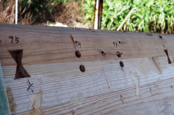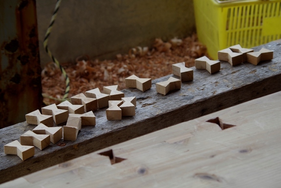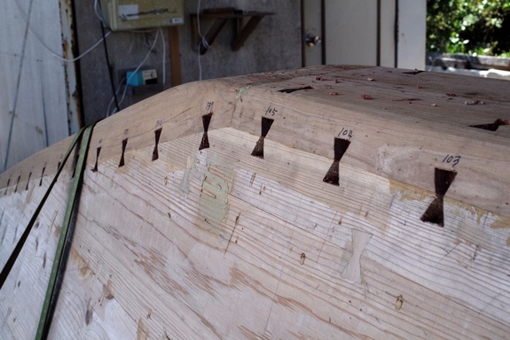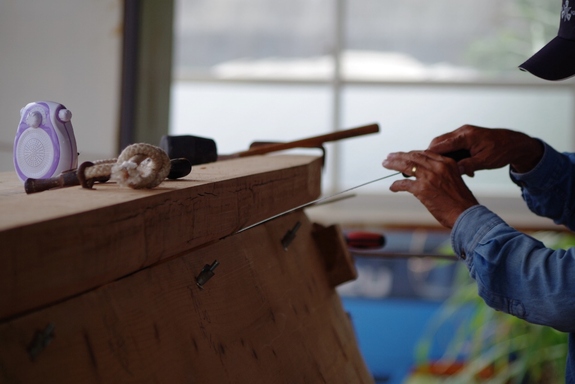 全て飫肥杉を接着する際には、”フンドゥー”と呼ばれる菱形の楔(くさび)を打ち込みます。その数、サバニ2隻でなんと合計350個を越えました。