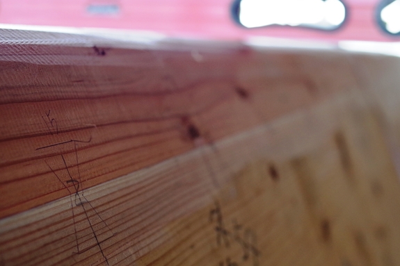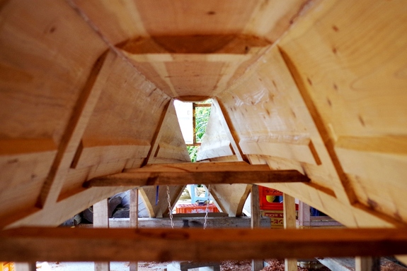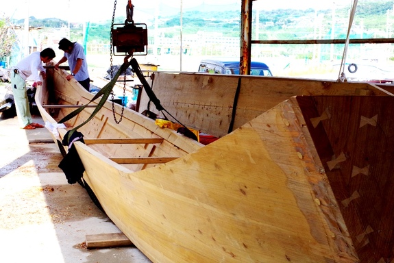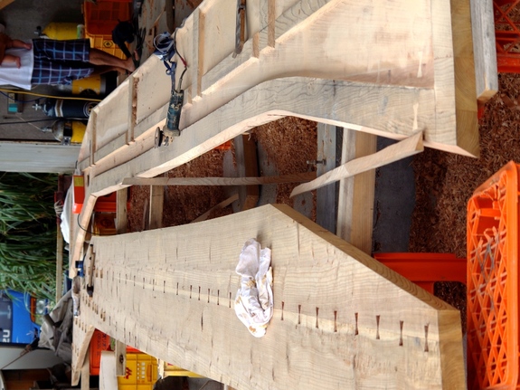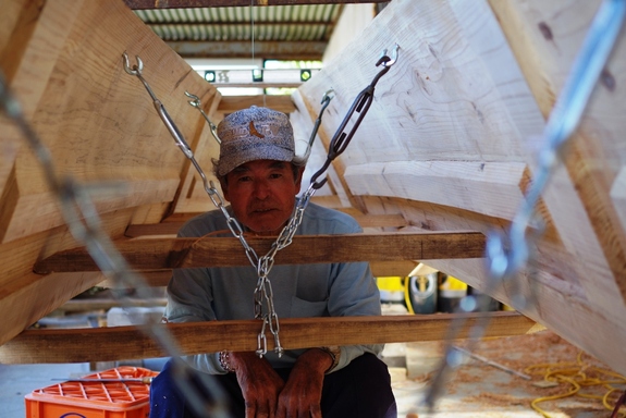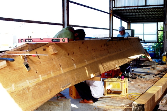 次は側板を徐々に曲げる、まさに伝統大工の匠な技術です。水平機を使って慎重に、そして時間をかけて力を加えながら曲げていきます。あまり急激に曲げようとすると当然板は割れてしまいます。高温多湿で育った宮崎日南特有の飫肥杉は国内で最も柔軟性に富んだ過ぎだと言われています。時間と共に見事に湾曲し、とても美しい船の形が見えてきました。