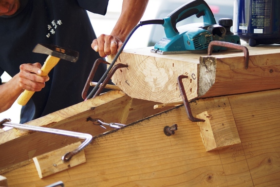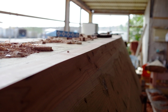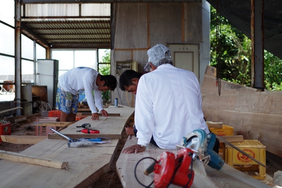 側板の曲げ作業が終わった後は、船の底辺部分になる底板(そこいた)の取り付けです。もともと沖縄の海人(漁師)はサンゴ礁に囲まれた浅い海域でサバニ漁をしていました。当然船の底を削ることもありますし、砂浜の上げ下ろしで日々ダメージを受ける船底を分厚い板がしっかりと守ります。