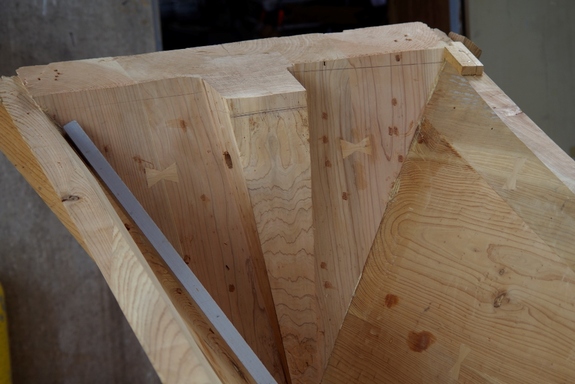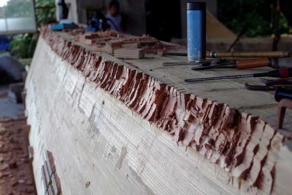 上が内側、補強デザイン後に掘り込み作業を終えた後の側板、下は外側、飫肥杉を3枚繋ぎ合わせガンネルの高い特注サバニ用の側板です。内外両側で計150個以上のフンドゥーを打ち込みました。