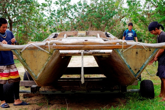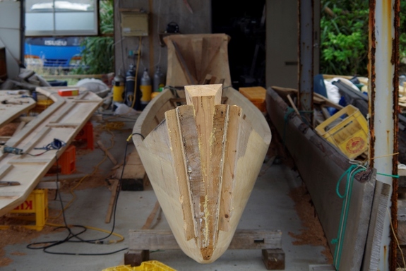 船の先端には、この島一番のハーレー船大工の嶺井さん独自のオリジナルデザインにしていただきました。海を滑走する鳥のくちばしをイメージでき、とてもかっこいいです。船尾部分は外洋航海目的の二号が停泊地でアンカーリングできるような頑丈な作りと、更にこれまで長年航海プロジェクトに携わってきた僕のアイディアが詰まった部分です。完成をお楽しみに!!
