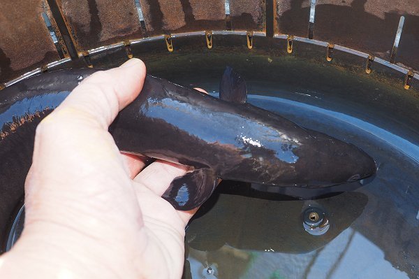 放流する親うなぎを紹介いたします。天然うなぎは黄うなぎと呼ばれるように黄(金色)をしていますが、産卵期を迎えた親うなぎは銀化(ぎんけ)し黒銀に輝きます。遠く西マリアナ海域までの旅のため、ヒレや浮袋を大きくした親うなぎを選別して保管、放流しています。