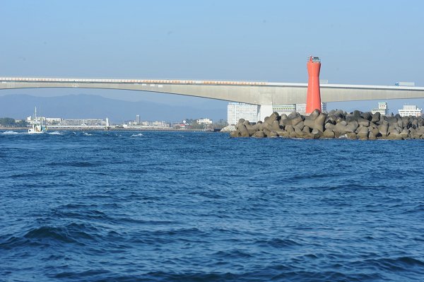 14時に舞阪漁港を出港した放流船は浜名湖が遠州灘につながる今切口を抜けて舞阪沖を目指します。今回の放流場所は今切沖3.0km、水深22m、水温19.7度となりました。