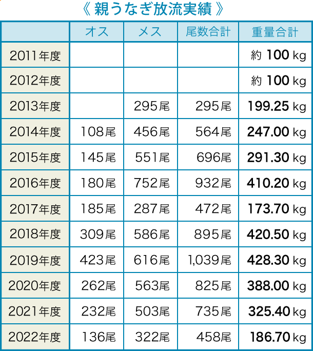 浜名湖発 親うなぎ放流連絡会の発足は2013年ですが、前身の親うなぎ放流有志会として放流活動は2011年から取り組んでいます。2011、12年には放流量は約100キロでしたが、浜名湖発 親うなぎ放流連絡会の発足以降は数字が伸び始め、2016年は400キロにも到達しました。しかし、2017年は気候変動とともに173キロで推移しました。そして、2018年は放流量が回復して、420.5キロを記録し、2019年は放流量が最高の428.3キロを記録、2021年は天候や状況により難しいなか325キロの親うなぎを記録しました。前年度2022年はさらに難しい状況のなか186キロの親うなぎを確保して放流いたしました。