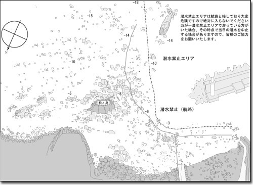ゴミは地図下側の浅瀬付近(5m以浅)や、地図中央より少し右側にある砂地に多かったです。また、ダイビング用のガイドロープに、漁網やルアーが引っ掛かっている状況がしばしば見られました。前回、川奈で絡まった漁網を回収できなかった反省を生かし、水中にハサミを持っていきました。漁具の回収にハサミが活躍しました!