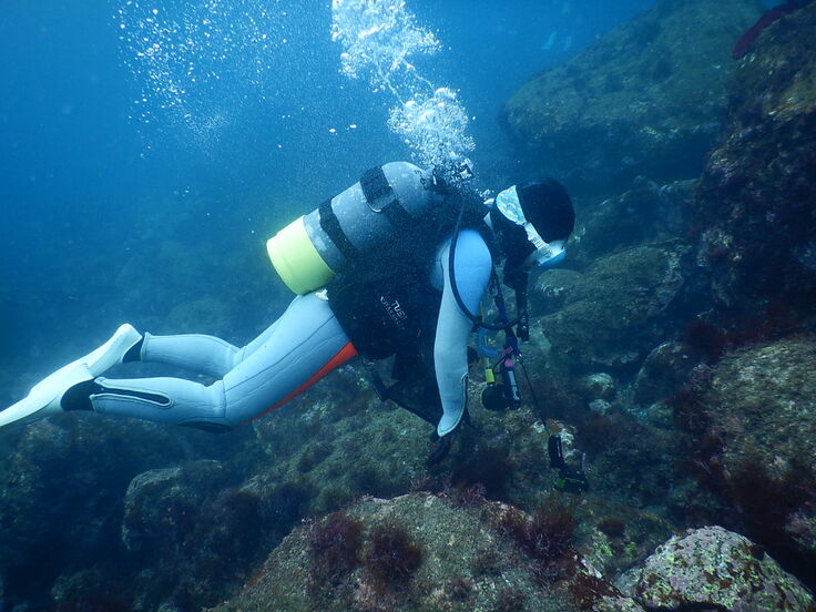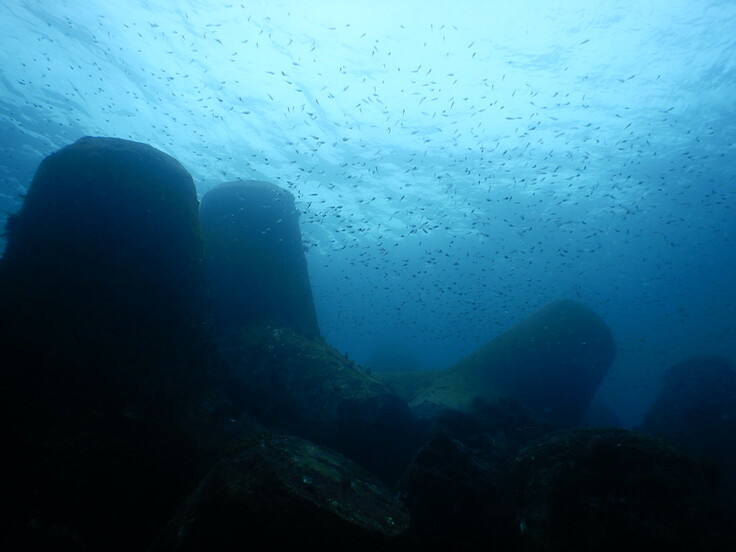 このプロジェクトを支援してくださっているダイビングサークルの先輩方に声をかけ、四人で清掃を行ってきました。お世話になったのは、いとう漁協八幡野支所ダイビングサービスさんです。