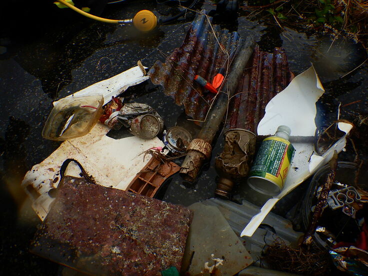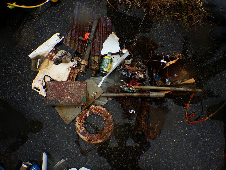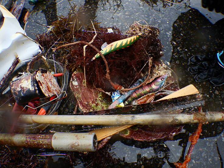 例によって、ルアーや重り、ジェット天秤などの釣りゴミと空き缶のゴミが多かったです。他には大きなプラスチック片や塩ビパイプなどのゴミが目立ちました。また、写真には写っていませんが小さなビニール袋や紙ごみもたくさん拾いました。