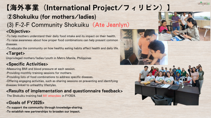 Joining the Shokuiku training enlightened me about food combinations and nutrition. Over time, I was given the opportunity to share what I’ve learned through UNIQUEASE. I’m not just learning for myself — I’m also learning to share with people in each community.
