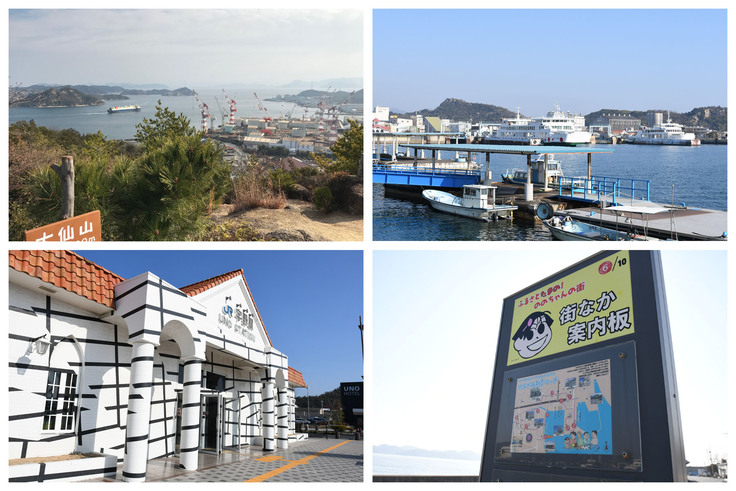 (現在の玉野市内。左上から時計回りに、地元にそびえる大仙山の頂上から見た造船所▽離島航路が発着する宇野港の風景▽人気漫画「ののちゃん」のキャラクター入り案内板。ののちゃんの作者いしい・ひさいちさんは玉野市出身▽現代アート作品でもあるJR宇野駅舎)