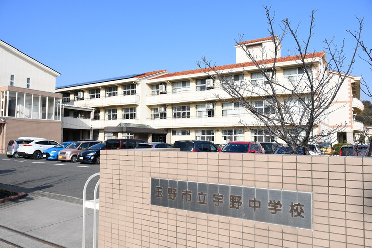 宇野中学校は、JR宇野駅から徒歩10分程度の静かな地域にあり、周囲は住宅のほか、私立の築港ちどり保育園や市立築港小学校、県立玉野高校が立ちます。歴史は古く、もともと玉野市立第一中学校として1947年に創立し1950年に現校名に改称しました。現在の生徒数は約300人。素直な子ばかりで、ボランティア活動にも積極的です。