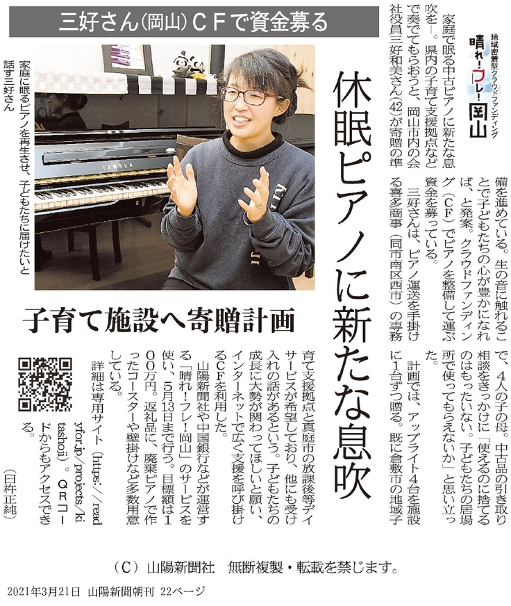(以前三好が挑戦したクラウドファンディングの紹介記事です。山陽新聞社の許諾を得て掲載)