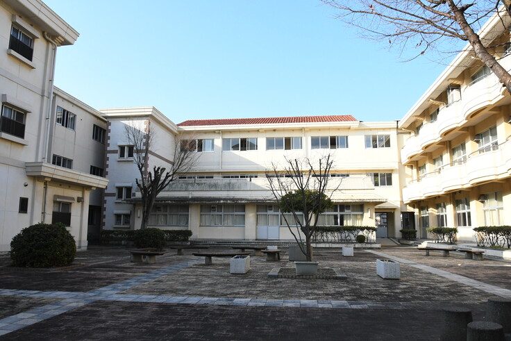 (宇野中学校です。住宅と保育園、学校が立ち並ぶ静かなエリアにあります)