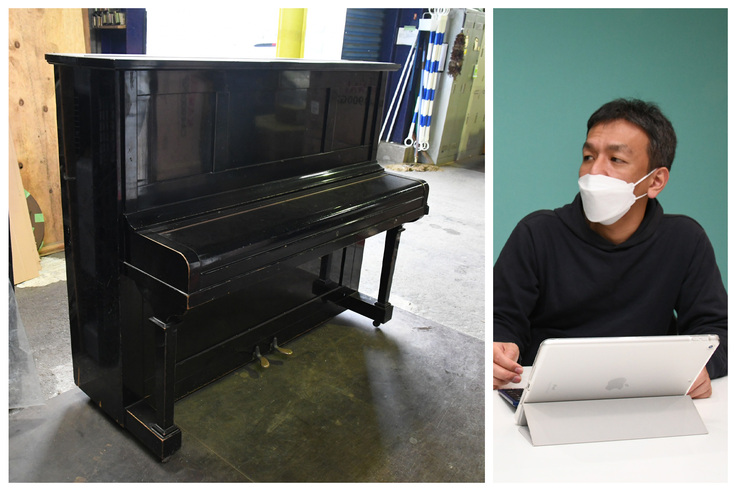 (写真左は再生を目指すピアノ。ふたを開いた時と表情が違います。写真右は岩崎です)