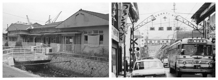 (写真左は1962年の玉保育園=玉野市教育委員会の許諾を得て掲載。写真右は、玉保育園近くの玉商店街で1972年の撮影=山陽新聞社の許諾を得て掲載)