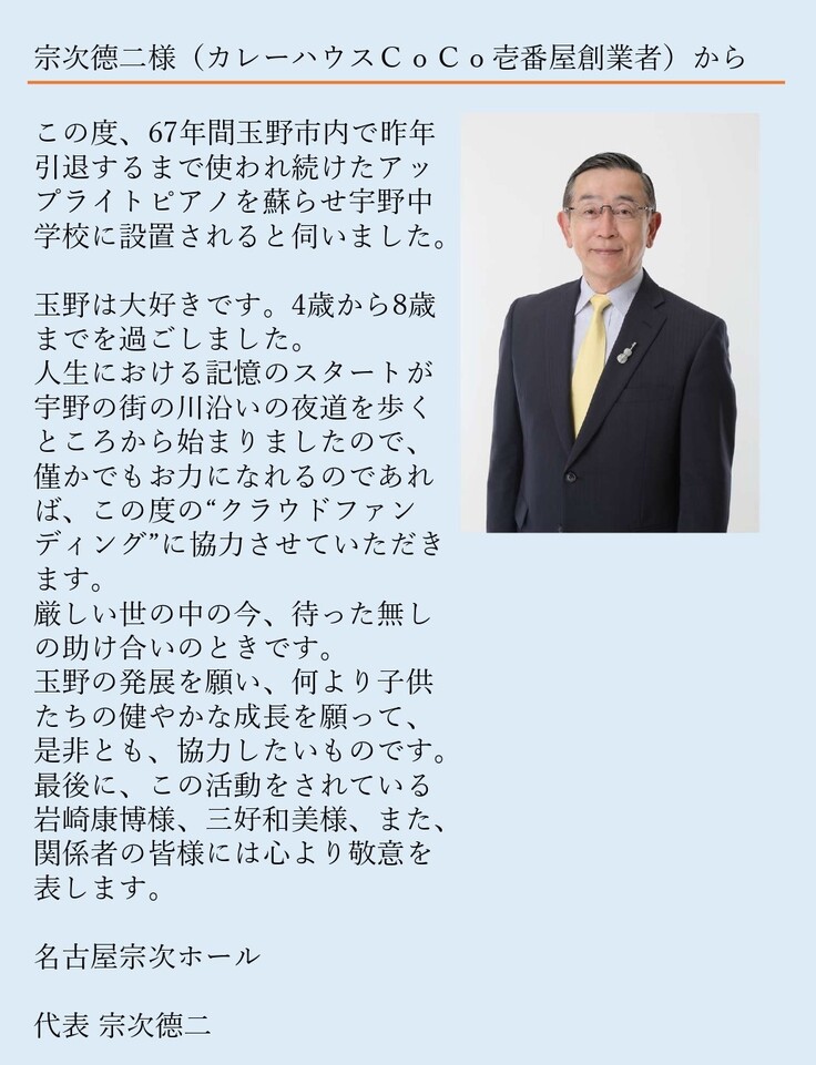 私たちの企画や思いに触れていただいたカレーハウスCoCo壱番屋創業者の宗次德二様から、温かな応援メッセージを賜りました。宗次様は、クラシック音楽専門「宗次ホール」(名古屋市)の代表をお務めで、音楽にも大変造詣の深い方でもいらっしゃいます。応援メッセージを本ページの最後でご紹介させていただきました。ぜひ、お読みください。