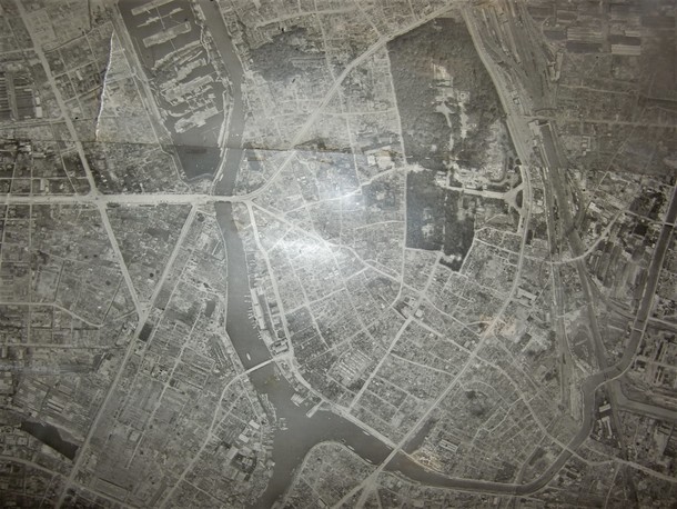 写真中央のやや下寄りの部分だけ周りより黒く見える所があると思います。 その部分が空襲で難を逃れた場所であり、旧魚半別邸のある場所になります。