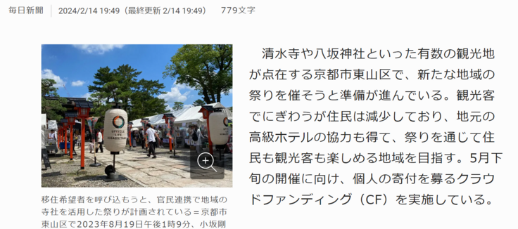 祭り開催で移住者呼び込め 京都の観光地・東山高級ホテルも協力